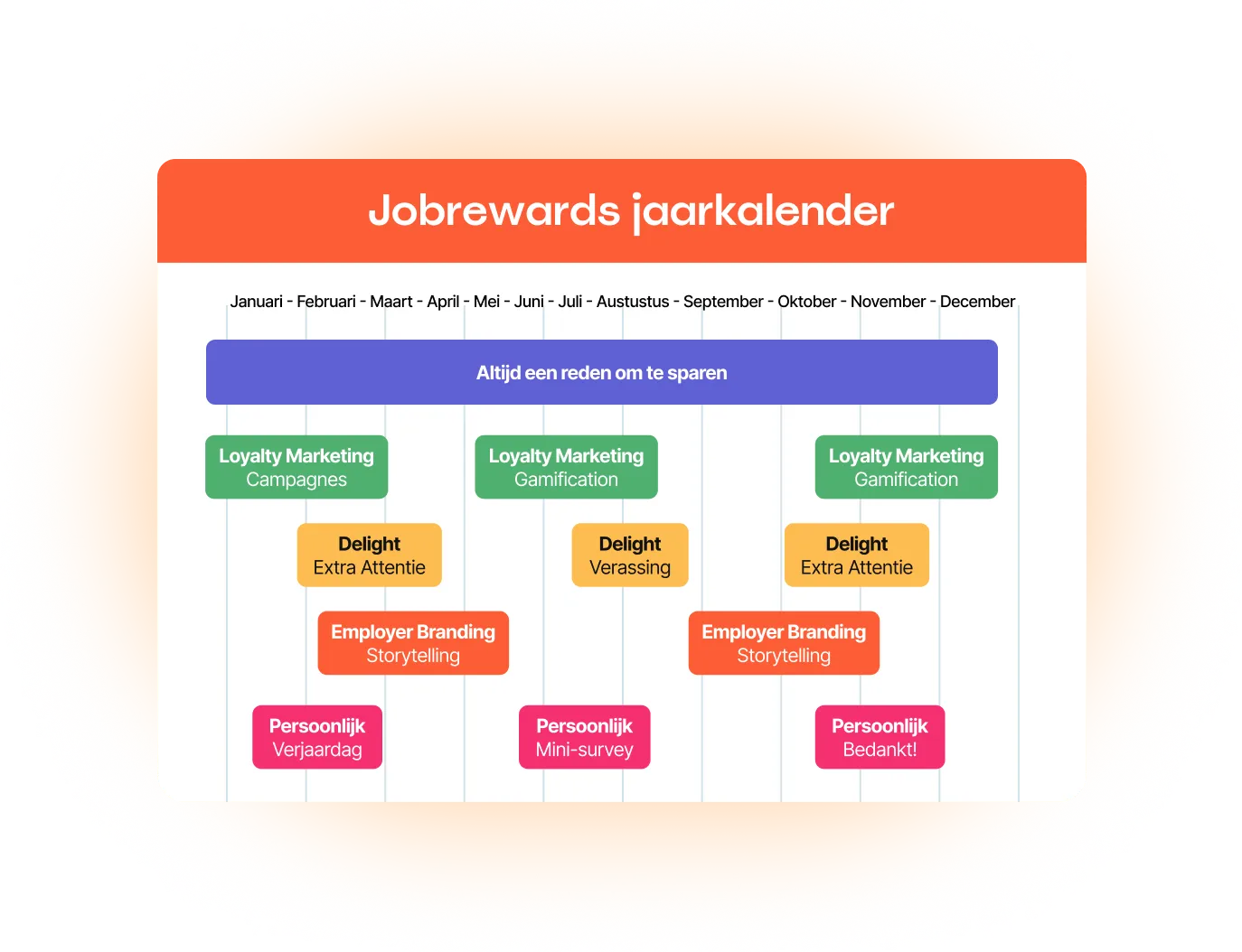 JobRewards maakt gebruik van een uniek beloningssysteem op basis van gedrag, (team)prestatie, betrokkenheid en ontwikkeling. Zo is er altijd een reward die past, op elk moment van het jaar.